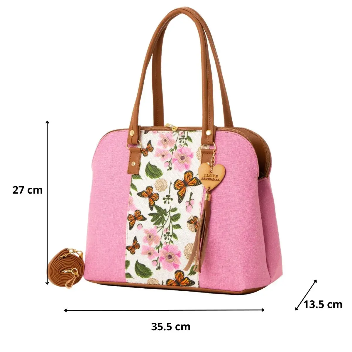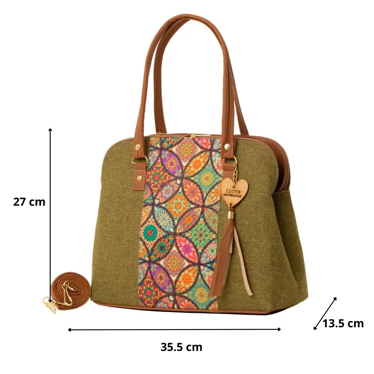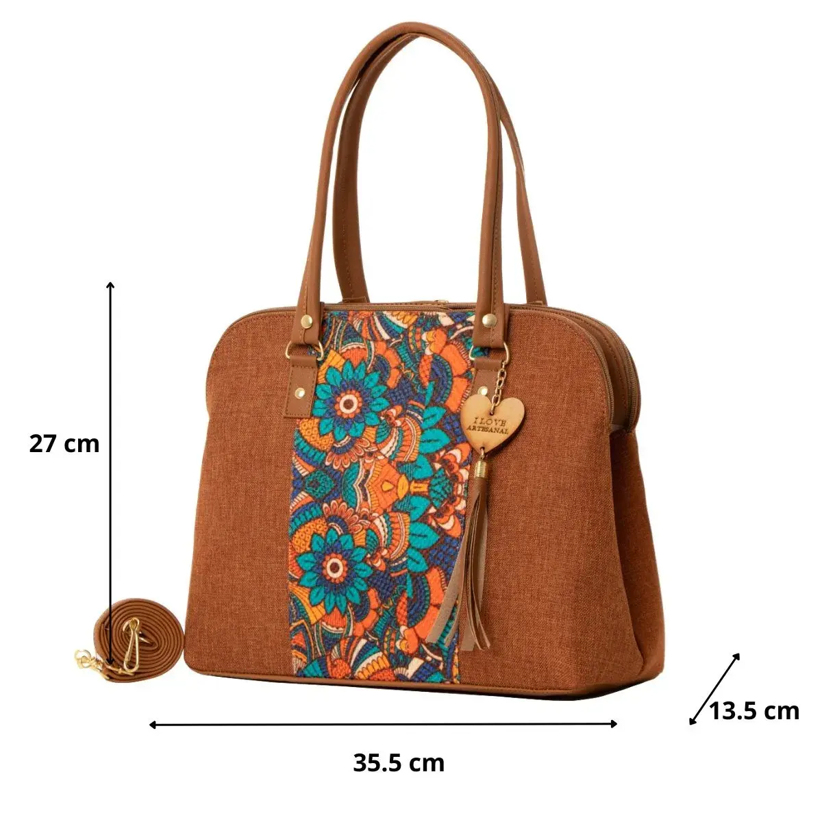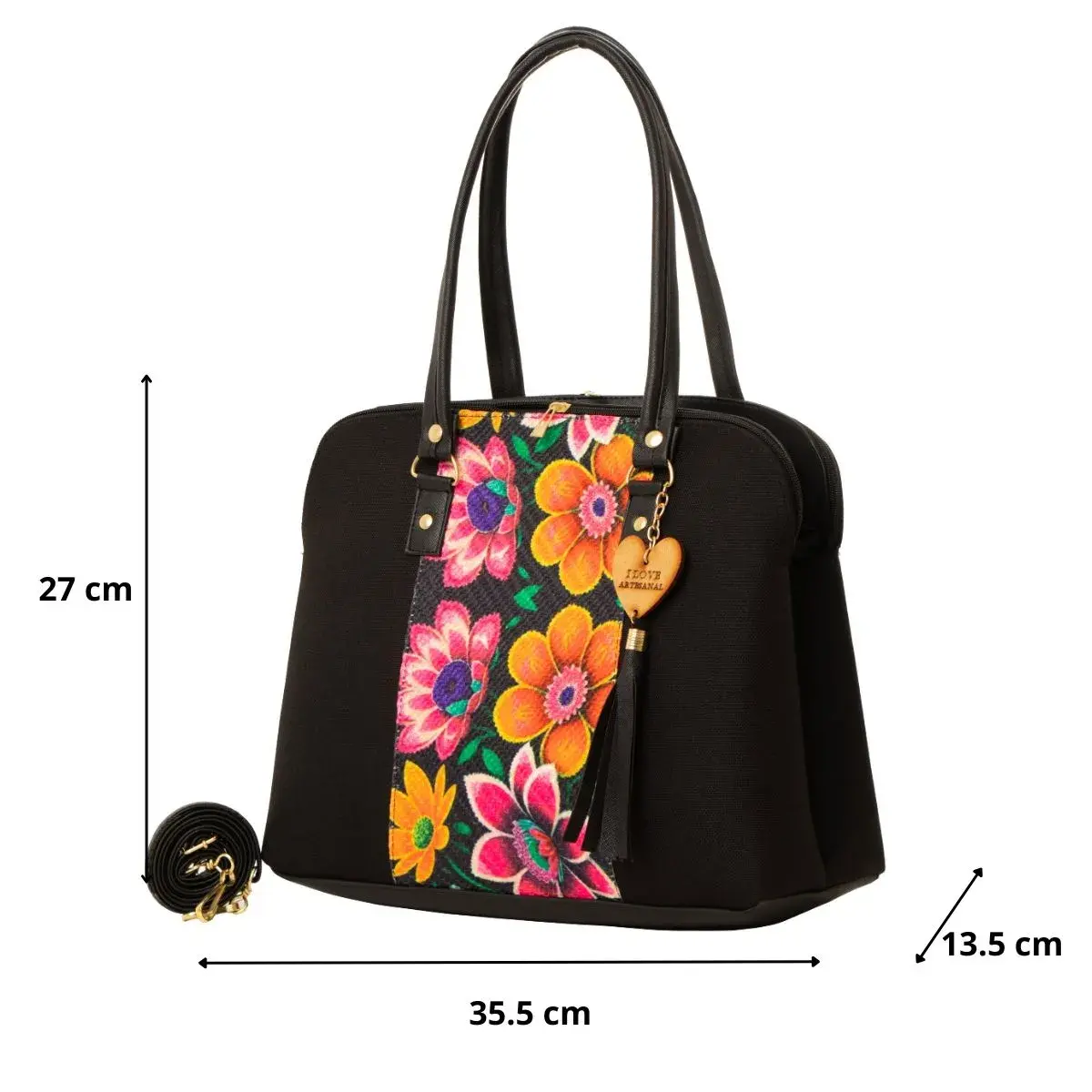 La Bolsa Artesanal estilo Mexicano de moda, ∞ forma parte del catálogo 2025. ∞ Compartimiento con cierre en la parte trasera. ∞ Asa larga para cruzar al hombro. ∞ Medidas: Ancho: 35cm Alto: 27cm y Profundidad: 13cm ∞Material: Sintético Premium o llamada Piel Vegana, ∞ Forro Interior: Textil. ∞ Detalle Placa Metálica color Dorado.∞